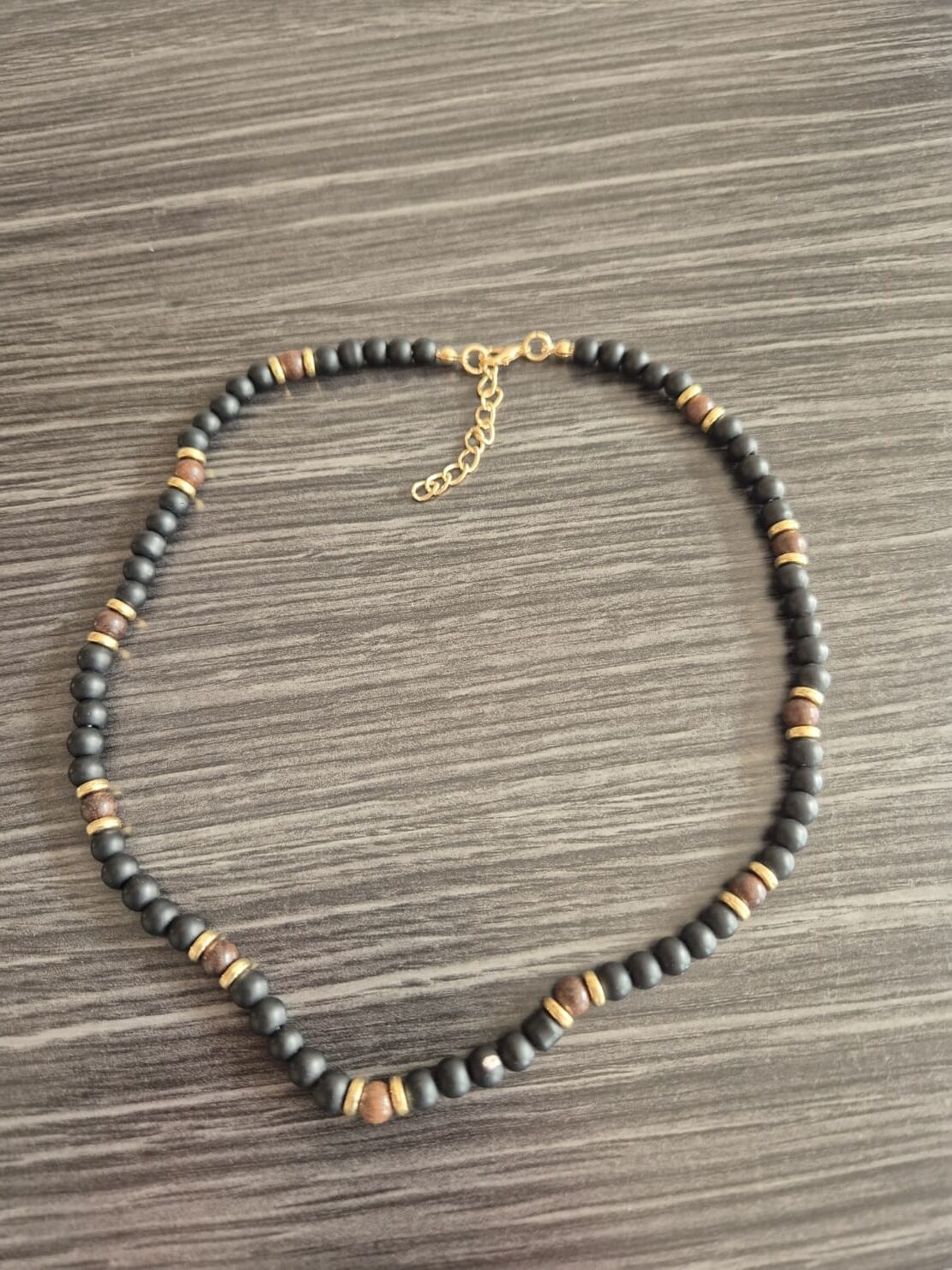 - Material: Pequeñas cuentas redondas de color negro mate, cuentas cilíndricas de madera, cierre y cadena de extensión dorados